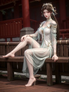 a young Asian woman is seated on a wooden bench. She is wearing a sleeveless white dress adorned with white flowers. Her hair is pulled back in a ponytail, and her eyes are a piercing blue. The woman's feet are bare, her left foot is resting on the wooden floor, adding a touch of balance to the scene. The backdrop of the scene is blurred, creating a stark contrast to the woman's white dress.zichu