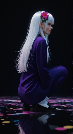 masterpiece, best quality, amazing quality, absurdres, newest, very awa,Shi1ro_vo1d_illu, glitch art,glitch, blurry edges, film grain,1girl, flower, hair flower, socks, hair ornament, long hair, white socks, black footwear, squatting, long sleeves, shoes, reflection, black background, white hair, from sidescenery, volumetric lighting
