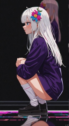 masterpiece, best quality, amazing quality, absurdres, newest, very awa,Shi1ro_vo1d_illu, glitch art,glitch, blurry edges, film grain,1girl, flower, hair flower, socks, hair ornament, long hair, white socks, black footwear, squatting, long sleeves, shoes, reflection, black background, white hair, from sidescenery, volumetric lighting