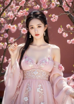Capture a stunning image of ancient and modern beauties standing serenely amidst a sea of vibrant peach blossoms. Framed from directly above, the scene unfolds with exquisite realism: delicate skin as pale as snow, intricate eyebrows, and luscious black hair lightly swept back. Red lips slightly parted, embroidered long skirt rustling in the gentle breeze. The complex patterns on her garments reflect the warmth of her porcelain complexion. Hundreds of peach blossoms dance through the air, swirling around her shoulders and hair like tiny stars. The atmosphere is one of elegance, silence, and purity, evoking a vivid summer's day that's intoxicating.