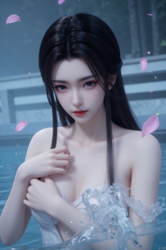 A girl, in water, long black hair, blue eyes, pale skin, shiny skin, yuanyao, high quality, master work, bare skin,surround by water,Anger,Blush,Angry,Dodge,Hold your chest with your hands,,There are pink petals falling in the air,The water splashed,