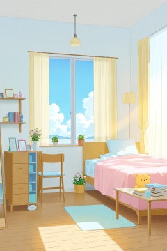 sky, day, cloud, indoors, blue sky, pillow, book, no humans, window, bed, chair, stuffed toy, table, sunlight, stuffed animal, bottle, plant, curtains, towel, scenery, wooden floor, mirror, potted plant, lamp, bedroom, shelf, flower pot,cxbackground