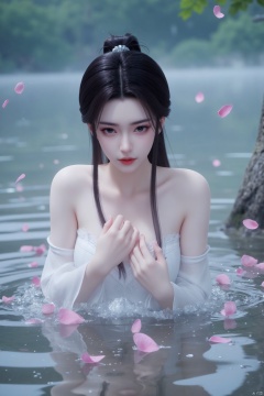 A girl,Mature woman,Sister Yu,30 years old, Sit by the water, long black hair, blue eyes, pale skin, shiny skin, yuanyao, high quality, master work, bare skin,surround by water,Anger,Blush,Angry,Dodge,Hold your chest with your hands,,There are pink petals falling in the air,The water splashed,petal censor