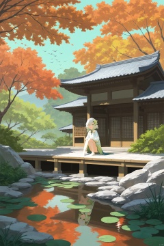 masterpiece,best quality,elf girl,pointy_ears, smile, small breast, white hair,green hair,green eyes,symbol-shaped pupils, bangs, cross-shaped pupils, hair ornament, gradient hair, side tonytail, outdoors, day, water, tree, no humans, bird, leaf, scenery, reflection, rock, autumn leaves, architecture, east asian architecture,cxbackground