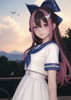 score_10,score_9,score_8_up,score_7_up,1girl,purple eyes,pink hair,multicolored hair,colored inner hair,solo,dress,long hair,looking at viewer,hair ornament,white dress,bird,streaked hair,smile,blush,sailor collar,neckerchief,outdoors,sky,short sleeves,closed mouth,black hair,blue sky,from side,hair between eyes,brown hair,cloud,hair bow,