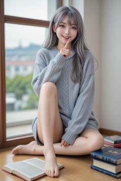 masterpiece,best quality,illustration,ultra detailed,hdr,Depth of field,(colorful),PVC Style,1girl,long hair,elaina (majo no tabitabi),solo,barefoot,ahoge,sweater,sitting,looking at viewer,smile,indoors,wariza,blue eyes,blurry,open mouth,book,grey hair,blurry background,bare legs,long sleeves,reflection,feet,hair between eyes,window,grey sweater,index finger raised,cable knit,aran sweater,:d,toes,legs,artist name,full body,very long hair,soles,score_9_up,score_8_up,score_7_up