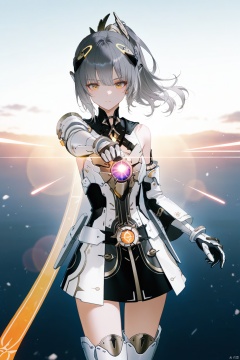 1girl, solo,nanami/punishing gray raven,long hair, bangs, thighhighs, dress, bare shoulders, yellow eyes, ponytail, grey hair, armor, gauntlets, gradient,depth of field, light particles, lens flare, (artist:quasarcake:0.8),extreme aesthetic,(wlop:0.6), wanke,rella,wanke,masterpiece,best quality,good quality,newest ,year 2024, year 2023, very aesthetic,absurdres,Visual impact, A shot with tension, ultra-high resolution,32K UHD,sharp focus,best quality,masterpiece,Emotionalization masterpiece, unconventional supreme,masterful details,with a high end texture,in the style of fashion photography, (Visual impact:1.2),giving the poster a dynamic and visually striking appearance,impactful picture,offcial art,colorful ,splash of color, movie perspective, masterpiece,best quality,amazing quality,very aesthetic,absurdres,best quality,newest,