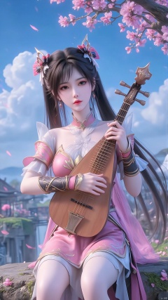 In the vast dreamlike fairyland, a fairy with graceful figure and short black hair sat quietly on the fairy stone in the distance. In her arms she held the pipa, a simple yet extremely gorgeous Chinese musical instrument. The fairy is dressed in a gauze white dress, and her clothes are fluttering gently in the wind, as if she is surrounded by the spirit of a fairy. The corners of her clothes are also embroidered with lively flowers and flying butterfly shadows, as if she will break out of her clothes at any time and fly to this vast fairyland. She has a beautiful face, her skin is as good as snow, her eyebrows are as dark as afar, and her eyes seem to be filled with bright stars. She stared intently at the Yao Qin in front of her, her slender fingers gently resting on the strings. With your fingertips, the fairy music curls up, sometimes like a gurgling stream in the valley, crisp and sweet; sometimes like the breeze blowing through the bamboo forest, quiet and gentle; sometimes like the roar of cranes in the sky, ethereal and distant, the beautiful music seems to penetrate the clouds and mist , reaching every corner of the fairy world.