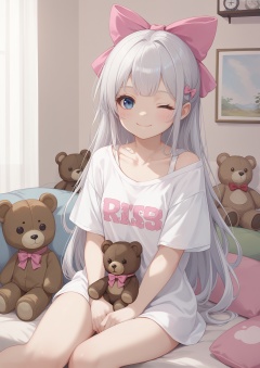 score_10,score_9,score_8_up,score_7_up,1girl,long hair,stuffed toy,stuffed animal,solo,one eye closed,blue eyes,bow,sitting,shirt,hair bow,blush,looking at viewer,pink bow,smile,white hair,t-shirt,ribbon,white shirt,short sleeves,teddy bear,off shoulder,wariza,collarbone,indoors,closed mouth,grey hair,