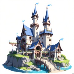 DTJZ, Game individual building, A meticulously crafted digital illustration of a fairy-tale castle with towering turrets and magical gardens. The castle boasts grand halls and enchanted chambers, with a drawbridge spanning a moat. The foreground showcases whimsical creatures and colorful flowers. The background is a pristine white, drawing focus to the castle's enchanting charm. The composition uses curves and organic shapes, emphasizing the structure's fairy-tale quality. The lighting is soft and magical, adding to the castle's dreamlike ambiance. The image is a feast for the imagination.