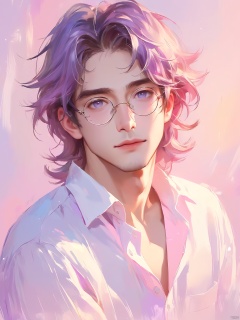A charming man with disheveled hair and round, acetate glasses. His eyes sparkled with mischief, and he wore a classic white button-down shirt with the sleeves rolled up. The background is a soft, pastel gradient of pink and lavender. The light was soft and dreamy, giving his face a slightly ethereal quality.