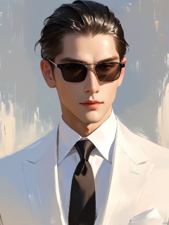 A sleek and sophisticated man with slicked-back hair and rectangular, prescription sunglasses. His suit was tailored to perfection, and he wore a crisp, white dress shirt with a thin, black tie. The background is a minimalist, monochrome palette of black and white. The light was precise and controlled, highlighting every detail of his well-groomed appearance.