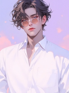 RHFG, A charming man with disheveled hair and round, acetate glasses. His eyes sparkled with mischief, and he wore a classic white button-down shirt with the sleeves rolled up. The background is a soft, pastel gradient of pink and lavender. The light was soft and dreamy, giving his face a slightly ethereal quality.