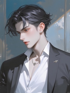 RHFG, A young man with sleek, straight raven-black hair donned a crisp white button-down shirt paired with a tailored charcoal grey suit jacket. He had a serious demeanor as he scanned the room. The background was a modern abstract painting dominated by cool blues and silvers. Around his neck was a fine silver chain with a minimalist disc pendant, and his ears were adorned with small, geometric gold earrings. The overhead lighting emphasized the fairness of his skin.