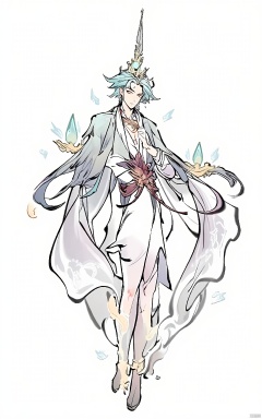 GFLH, A male spirit medium in flowing, ethereal robes, holding a divining rod adorned with crystals. His eyes are closed in concentration, as he communicates with the spirits that inhabit the white space.