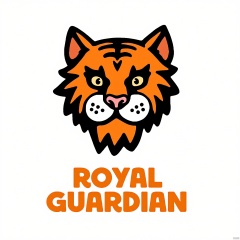 CTLG, TIGR, the tiger emblem, adopts a powerful and majestic design. The tiger's coat is a striking orange with black stripes. Its eyes are a fierce amber, signifying bravery and strength. The white backdrop is clean, featuring "ROYAL GUARDIAN" in bold orange at the footer.