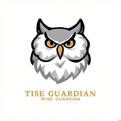 CTLG, OWLW, the owl wisdom, showcases a sleek and wise design. The owl's feathers are a soft gray, with golden accents on its beak and eyes. Its wise eyes are deep brown, conveying insight and knowledge. The white canvas is simple, with "WISE GUARDIAN" in elegant gold italic below the logo.