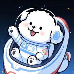 SDTX, A cartoon avatar of a white anthropomorphic poodle in a astronaut suit, waving from a spaceship. The background is a gradient from deep space black to starry night blue.