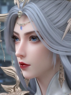 a close-up of a woman's face is depicted. Her eyes are a piercing blue, and her hair is a vibrant shade of gray, while her lips are a darker shade of red. She is wearing a silver necklace, adding a touch of color to her face. The background is blurred, creating a stark contrast to the woman's features.