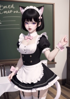 masterpiece,best quality,animal ears,tail,thighhighs,maid,cat ears,maid headdress,cat tail,solo,black hair,purple eyes,white thighhighs,short hair,apron,garter straps,1girl,open mouth,bow,short sleeves,detached collar,wrist cuffs,balloon,maid apron,looking at viewer,dress,blush,pink bow,frills,indoors,cat girl,puffy sleeves,bowtie,blurry,puffy short sleeves,white apron,chalkboard,blurry background,black dress,animal ear fluff,standing,embarrassed,frilled apron,pink bowtie,