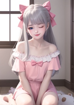 masterpiece,best quality,1girl,long hair,stuffed toy,stuffed animal,solo,one eye closed,blue eyes,bow,sitting,shirt,hair bow,blush,looking at viewer,pink bow,smile,white hair,t-shirt,ribbon,white shirt,short sleeves,teddy bear,off shoulder,wariza,collarbone,indoors,closed mouth,grey hair,