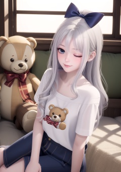 masterpiece,best quality,1girl,long hair,stuffed toy,stuffed animal,solo,one eye closed,blue eyes,bow,sitting,shirt,hair bow,blush,looking at viewer,pink bow,smile,white hair,t-shirt,ribbon,white shirt,short sleeves,teddy bear,off shoulder,wariza,collarbone,indoors,closed mouth,grey hair,