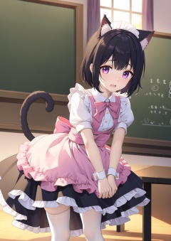 masterpiece,best quality,animal ears,tail,thighhighs,maid,cat ears,maid headdress,cat tail,solo,black hair,purple eyes,white thighhighs,short hair,apron,garter straps,1girl,open mouth,bow,short sleeves,detached collar,wrist cuffs,balloon,maid apron,looking at viewer,dress,blush,pink bow,frills,indoors,cat girl,puffy sleeves,bowtie,blurry,puffy short sleeves,white apron,chalkboard,blurry background,black dress,animal ear fluff,standing,embarrassed,frilled apron,pink bowtie,