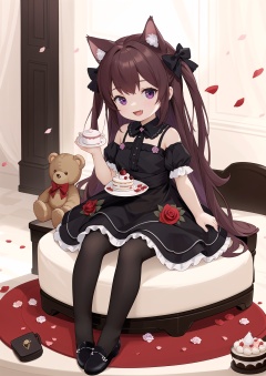 masterpiece,best quality,1girl,purple eyes,animal ears,solo,rose,shoes,black footwear,dress,flower,cup,food,smile,stuffed toy,cake,puffy sleeves,long hair,thighhighs,teacup,stuffed animal,red flower,red rose,short sleeves,brown hair,two side up,black dress,puffy short sleeves,petals,cake slice,:d,animal ear fluff,looking at viewer,no shoes,detached sleeves,frills,macaron,frilled dress,teddy bear,black thighhighs,very long hair,bow,tiered tray,plate,single shoe,minigirl,sitting,mini person,hair ornament,holding,cat ears,hair bow,table,fang,pantyhose,rose petals,full body,open mouth,