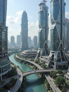 ((masterpiece)), ((best quality)), 8k, high detailed, ultra-detailed, In a futuristic modern metropolis, futuristic punk style, glass and streamlined urban structures, new Chinese architectural style, Aerial photography, Photography, Real scenery, 8K, Ultra detail,(Adequate sunlight 9.9),