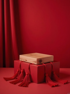 A stunning visual from the NHJ E-commerce booth, this photograph showcases a minimalist, yet sophisticated setup: a square, bamboo base with natural grains and knots sits atop a pedestal adorned with red silk tassels. The backdrop is a vivid, scarlet red.