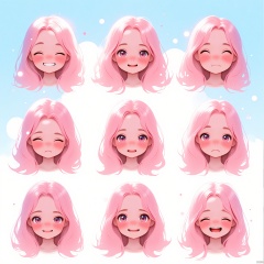 BQB,Character expression, A beautiful digital illustration showcases a girl with long, flowing pink hair, captured in nine enchanting expressions: giggling, blinking in surprise, looking curious, and more. The backdrop is a soft, baby blue, creating a serene atmosphere. The character stands out in pastel hues, arranged in a balanced grid. The style is whimsical and romantic, highlighting her large, luminous eyes and soft, rounded cheeks. The lighting is gentle and even, casting soft glows. The background melts into a gentle depth of field.