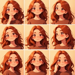 BQB,Character expression, A captivating digital illustration features a girl with wavy, chestnut hair, rendered in nine emotional moments: smiling warmly, looking thoughtful, gazing lovingly, and more. The background is a warm, terracotta color, complementing her earthy tones. The expressions are arranged in a harmonious grid. The style is intimate and heartfelt, focusing on her expressive eyes and soft, inviting smile. The lighting is soft and warm, casting gentle highlights. The background fades into a soft depth of field.
