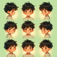 BQB,Character expression, A captivating digital illustration features a boy with short, dark hair, displayed in nine emotional moments: smiling shyly, looking thoughtful, gazing adoringly, and more. The background is a soft, sage green, creating a calming atmosphere. The expressions are arranged in a harmonious grid. The style is intimate and tender, focusing on his expressive eyes and soft, round cheeks. The lighting is soft and warm, casting gentle glows. The background fades into a soft depth of field.