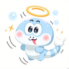 QWS, the trick-loving snake, wrapped in a tiny, angel halo, has big, innocent eyes and a tiny, white tongue sticking out in wonder. Its body is segmented into round, glowing orbs in shades of white, light blue, and silver, floating and drifting like bubbles. The background is a solid, untouched white.
