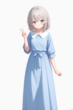 cxnice3,1girls, solo,high tonytail,simple background, white background,standing,long dress,V,hand up,dress,long dress,