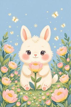 A serene, whimsical scene of a gentle creature, rendered in stunning 16k high-definition. In the foreground, a delicate, cup-shaped flower blooms with petals as soft as feathers, surrounded by a halo of warm light. The creature's large, shining eyes and endearing smile radiate kindness, as they tenderly cradle the flower in their paws. Against a serene, gradient-blue background, the composition is balanced, inviting the viewer to step into this soothing, healing world.