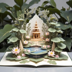 pop-up book, A serene meditation garden with a reflecting pool in the center. In the foreground, lotus flowers floated gracefully, while in the background, a peaceful pagoda stood amidst lush greenery. The scene was a tranquil oasis of calm and reflection.