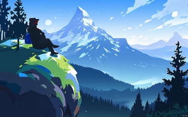HCCH, On a secluded mountain peak, a lone hiker rests against a moss-covered boulder, taking in the panoramic view of snow-capped peaks and valleys below. The crisp mountain air is filled with the scent of pine trees and the distant call of a mountain eagle.