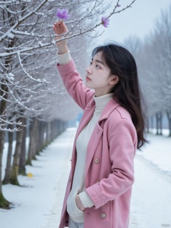 , Masterpiece, natural wonder, snow on branches, snow on the ground, a few green branches after frost, depth, simple background, perfect lighting, aesthetic conception, natural wonder, Scenery, uncleview, guohua,a woman standing,bust,Long view, shot from a distance,sideways,wearing pink thick coat and white sweater,head up,looking at a purple flower which on the tree,the girl is stretching her hand and wants to touch one flower which on the tree,Professional composition, natural light effect