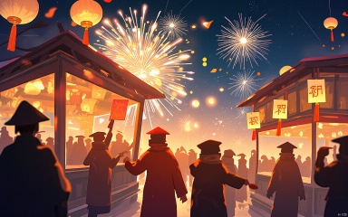 HCCH, In a bustling marketplace, children in red jackets and hats weave through stalls adorned with lanterns and red envelopes. They laugh and play amidst the clinking of bells and the aroma of roasted chestnuts, as the skyline glows with fireworks painting the night sky in vibrant hues of gold and silver. The air is filled with joy and anticipation, marking the arrival of the new year.