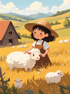 ETHB,Child insertion, A digital page from a children's book about farm life. A little farmer girl pets a fluffy sheep, both surrounded by a barn and fields of golden wheat. The sheep's eyes are soft and content, positioned near the bottom of the frame. The background fades into a distant landscape of rolling hills, emphasizing the simplicity of farm life. The aesthetic is rustic, with earthy tones and charming details. It fuses digital illustration with a farm-themed setting.