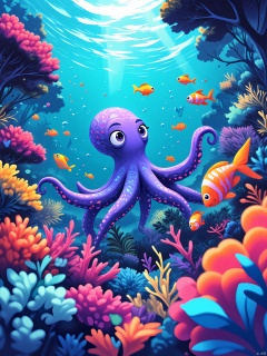 ETHB,Child insertion, A digital illustration for a children's picture book about the ocean. A curious little octopus peers out from behind a coral reef, its tentacles adorned with vibrant patterns. The ocean floor serves as the backdrop, with colorful fish swimming in a soft blur. The octopus's eyes are wide with wonder, positioned near the top of the frame. The aesthetic is mesmerizing, with contrasting colors that pop against the deep blue sea. It combines digital artistry with a playful, underwater theme.