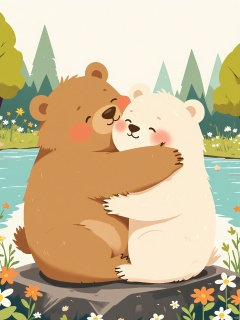 ETHB,Child insertion, A digital illustration for a children's book about friendship. Two bears hug tightly, one with a soft brown coat and the other with a creamy white one. They sit on a rock by a serene lake, surrounded by blooming flowers. The bears' eyes are closed in joy, positioned near the center of the frame. The background blends into a soft blur of nature, highlighting the warmth of their bond. The aesthetic is heartwarming, with gentle colors and a cozy atmosphere. It blends digital artistry with a timeless tale of friendship.