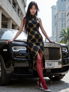 full body photo,Thin face, melon seed face, pointed face, master works, extremely high texture, well-designed composition, aesthetic, stunning beauty, highest picture quality, highest resolution. A long-haired woman wearing a black china dress with golden geometric patterns, with a long black ponytail, wearing wine-red thin stockings, wearing gray and white high heels, tall and tall, eyebrows like far Dai, eyes like autumn frost, slender legs, excellent proportion of the body. Leaning against a Rolls Royce Phantom, she looks sideways and poses casually and confidently. A city full of science fiction.solo,simple_background