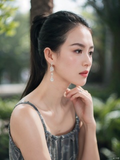 (RAW photo, 4k, realistic, exquisitely detailed skin),masterpiece,best quality,unity 8k wallpaper,ultra detailed,cinematic look,natural skin texture,extremely realistic skin texture,finely detailed face,(film grain:1.2),cinematic angle,Fujifilm XT3,,(highlydetailed),(bright scene),(A close-up shot of a woman with dark brown eyes, a pink lip, and a ring on her left hand. She is wearing a blue dress with a lace pattern on the shoulders. Her hair is pulled back in a ponytail, and she is wearing earrings on her ears. The background is blurred, but it appears to be a forest of trees.),(detailed lighting),(contrast),(mysterious atmosphere),,vivid illumination,,masterful technique,,harmonious composition,,immersive atmosphere,,stunning visuals,