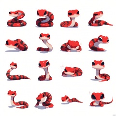 DWBQ, A 3x3 array of vibrant, expressive red and black snake emojis. Each emoji captures a different mood and action: top row left to right, coiled tightly with intense eyes, striking forward with a fierce expression, and sliding smoothly across the ground.