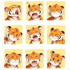 DWBQ,Illustration of a tiger with orange and black stripes, showcasing a variety of facial expressions in a 3x3 arrangement. Each look is unique, including amusement, frustration, awe, and curiosity. The tiger's whiskers stand out in most expressions. The background is a muted yellow, suggesting a sunny savanna. The style is lively and expressive, with bold strokes and vivid colors.