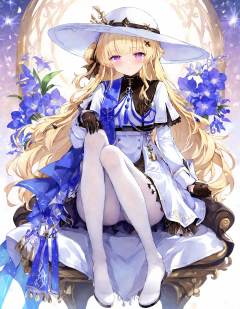 1girl, fb, solo, pantyhose, hat, white pantyhose, gloves, sitting, purple eyes, looking at viewer, dress, hair ornament, white headwear, bangs, blush, black gloves, flower, full body, long sleeves,<lora:ClearHand-V2:1>,<lora:通透世界transparent:0.5>,<lora:feibi:1>,