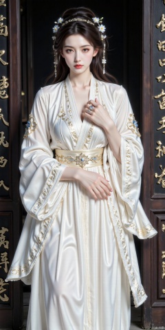 A young Asian woman stands elegantly in front of a stark black background, dressed in a flowing white kimono embroidered with delicate blue flowers on her headband. Her dark brown hair falls effortlessly down her back, complemented by piercing blue eyes that seem to sparkle in contrast to her rich tresses. A silver ring adorns her left hand, adding a touch of subtle elegance to her traditional attire. The black script-covered backdrop creates a striking visual tension against the woman's pure white robe, drawing attention to her serene yet powerful presence.