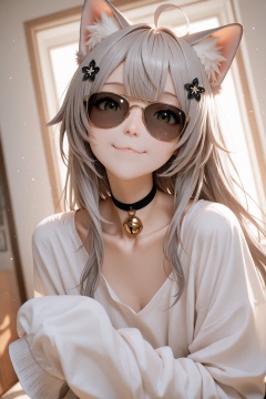 masterpiece,best quality,amazing quality,very aesthetic,absurdres,newest,extreme aesthetic,in the style of fashion photography,light particles,Visual impact,sharp focus,Emotionalization,impactful picture,depth of field,dutch angle,dynamic pose,1girl, solo, animal ears, sleeves past wrists, sunglasses, choker, ahoge, hair ornament, bell, grey hair, :3, sleeves past fingers, cat ears, black choker, animal ear fluff, long hair, white shirt, shirt, long sleeves, neck bell, looking at viewer, jingle bell, closed mouth, smile, collarbone, virtual youtuber